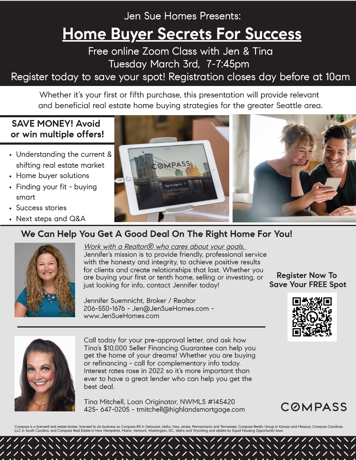 Jennifer Suemnicht, Seattle Real Estate Agent / Broker/ Realtor of Jen Sue Homes is licensed at Compass with offices in Seattle, Tacoma, Kirkland, & Bellevue, Washington. Jen’s mission is to provide friendly, professional service with honesty and integrity, achieving positive results, and creating relationships that last because of impeccable service. Whether you are buying your first or tenth home, selling, investing, or just looking for information… contact Jen today!
