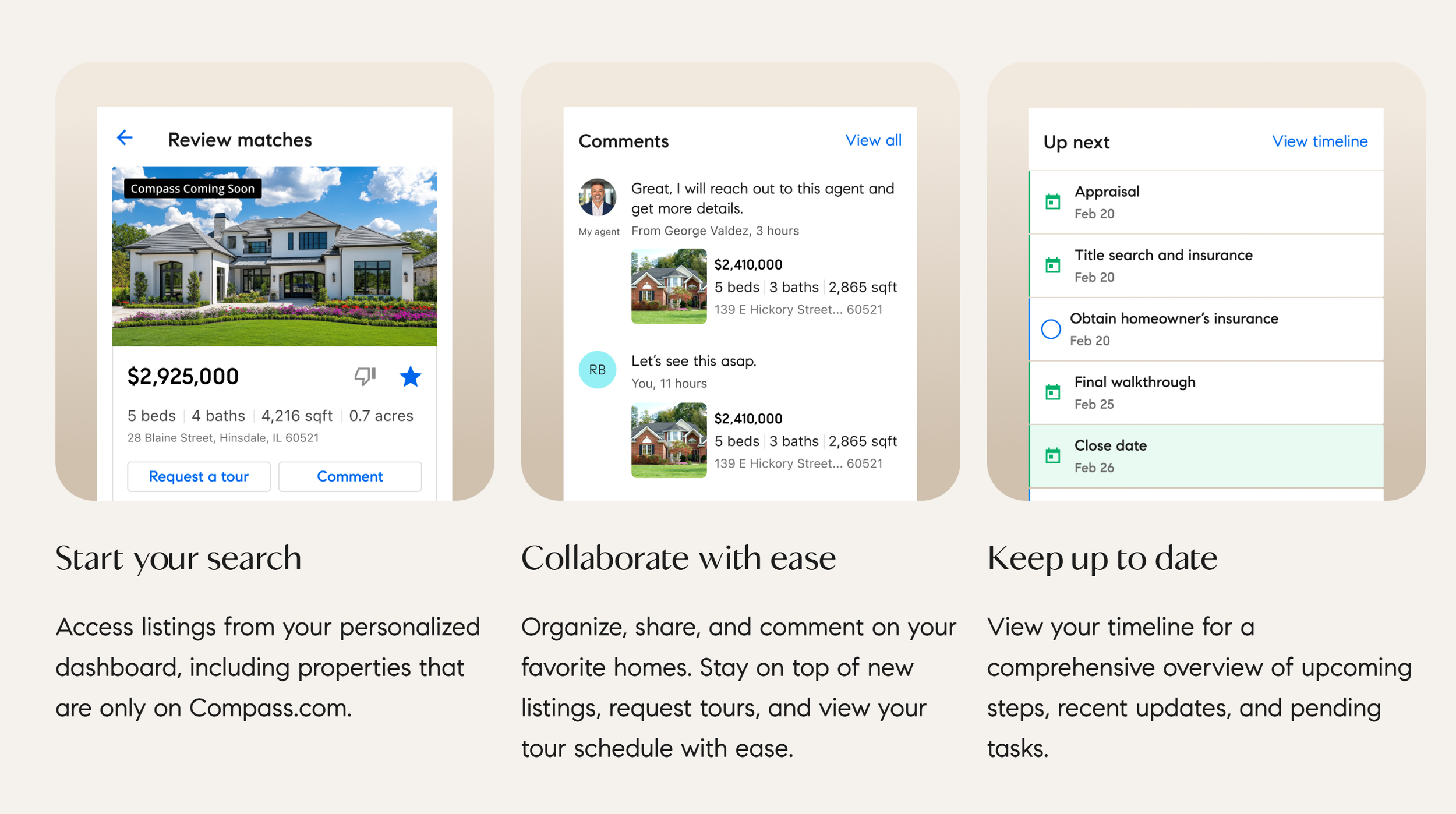 Compass One is the only platform designed to connect you and your agent through every phase of your real estate journey. Experience 24/7 transparency before, during, and after the transaction for total peace of mind.